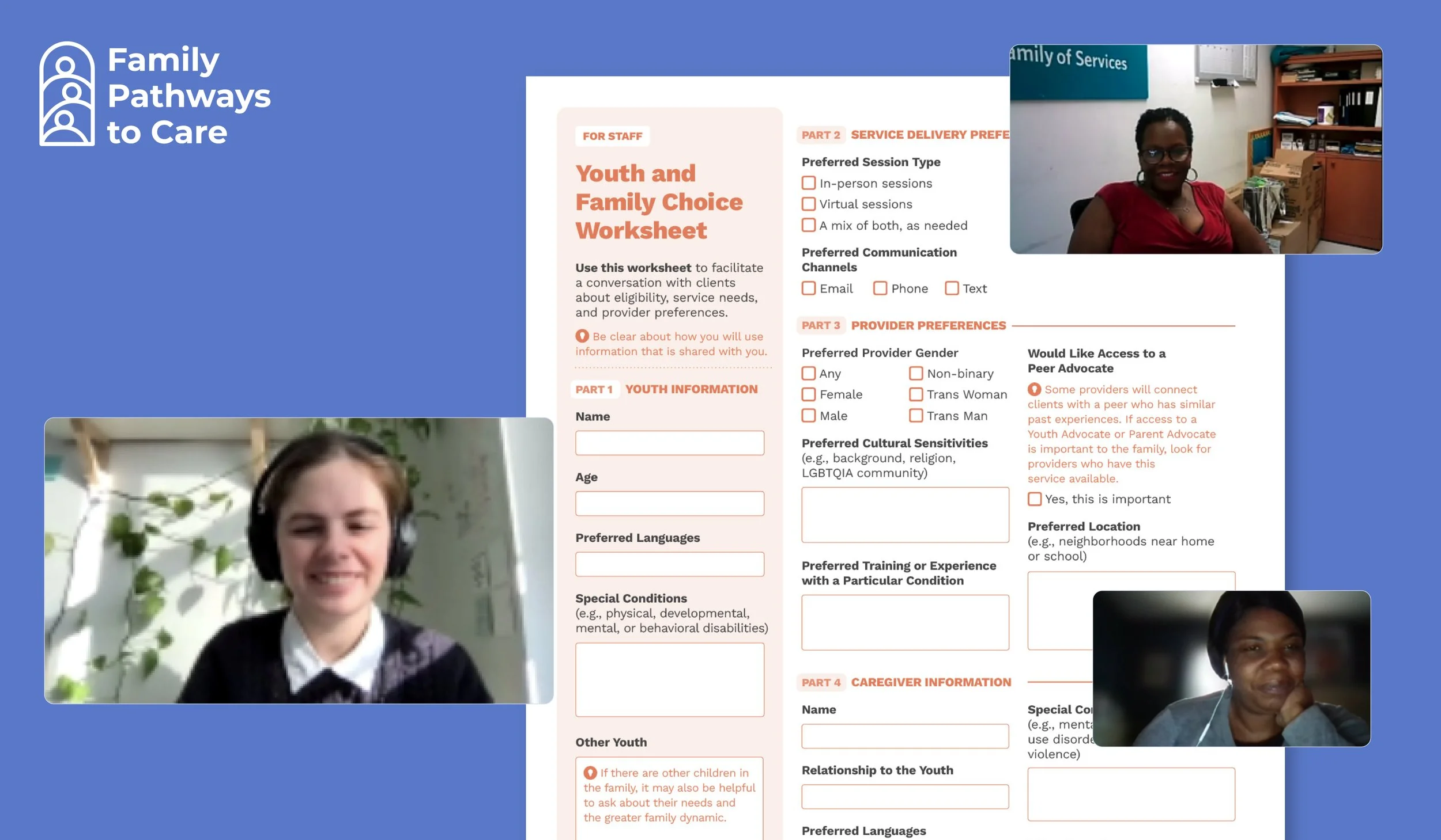 It includes a three-step process for making referrals drawn from best practices across the system, a tip sheet to help staff better leverage existing resource directories like NYC Well and NowPow, and a family-facing worksheet (see left) to ensure youth and family service preferences are accounted for.
